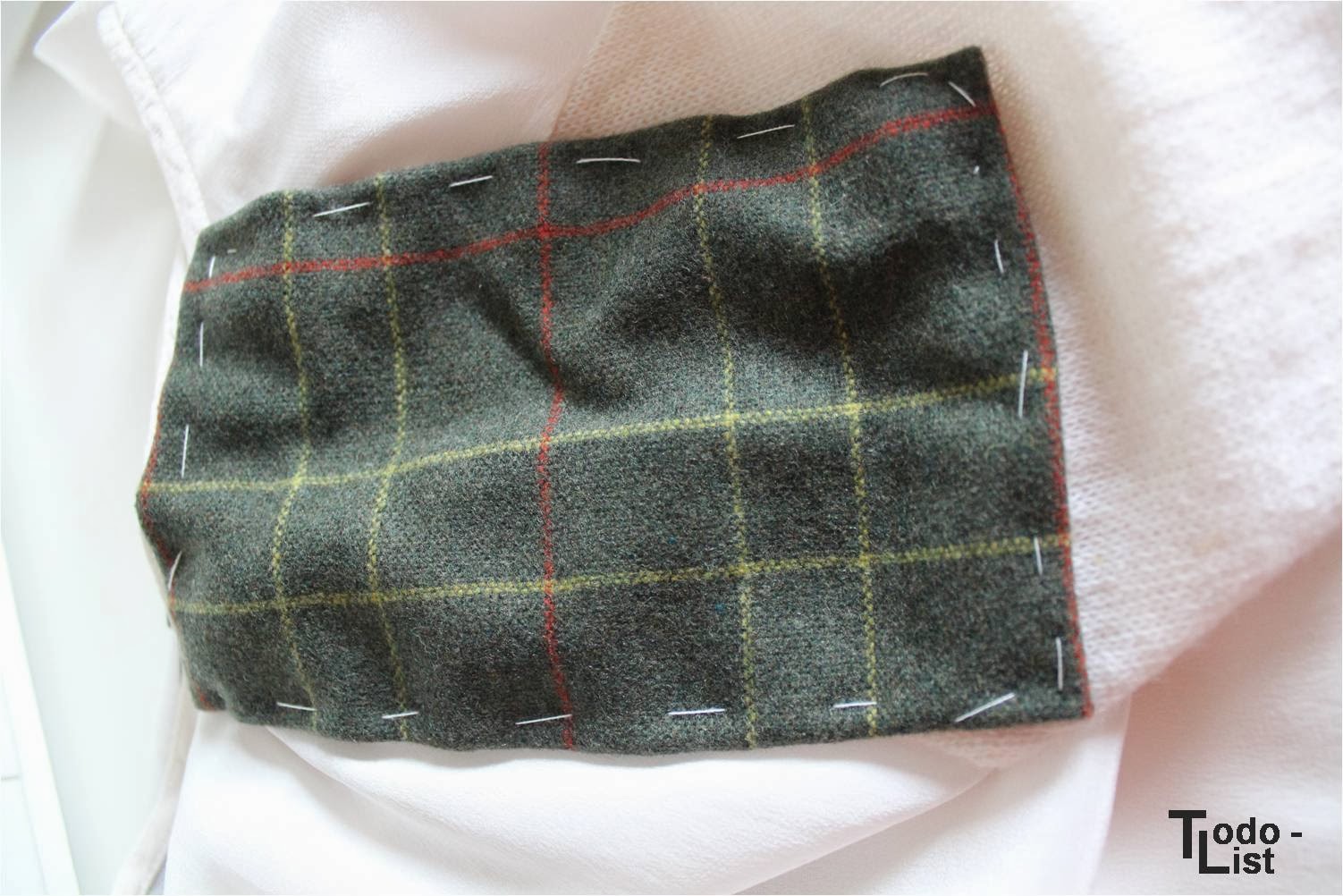 En primer lugar medimos el largo que debía tener la hombrera/adorno para poder tapar la costura de la carrera. Tras decidir el largo y ancho y cortar, hilvanamos sobre la blusa teniendo cuidado para que queden ambas a la misma altura.
